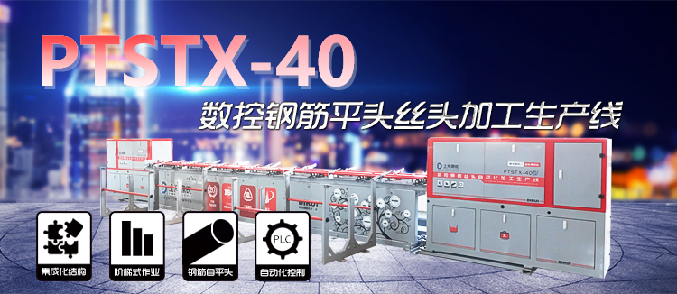 江蘇中動®PTSTX-40型數控鋼筋平頭套絲自動加工生產線 是由江蘇中動機械科技有限公司自主研發生產的大型鋼筋螺紋絲頭加工生產設備。它采用模塊化PLC控制技術將鋼筋切削平頭,剝肋,絞絲鋼筋端部螺紋加工過程串聯在一起,按工序流程來實現鋼筋絲頭的全自動流水線加工。和傳統的鋼筋加工模式相比,它可以大大降低操作者的勞動強度,提高生產效率,并保證成品絲牙質量不受到任何人為因素的影響,加工質量穩定可靠、螺紋一致性好,從而有效的降低了生產成本,倍受市場推崇。是很多工程承接者首選的鋼筋螺紋加工設備。